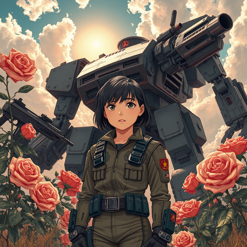 A young girl in a weathered futuristic suit stands confidently, her presence akin to a figure from a Soviet-era poster, blending elements of USSR stylings. In the backdrop, a dramatic juxtaposition of firearms and roses entwines, with a colossal mech looming under vibrant sunny skies. The scene is rendered in anime and manga aesthetics, showcasing dark, rich colors reminiscent of offset printing, exuding high detail. The poster-like composition is captured in 8k resolution, featuring intricate details and ornate elements, reminiscent of Johanna Rupprecht's and William Morris's illustrative styles, creating a piece that's trending on ArtStation.