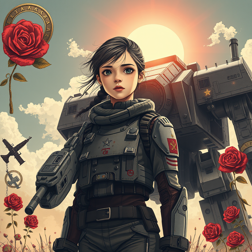 A young girl in a weathered futuristic suit stands boldly, embodying the essence of a Soviet poster with her determined gaze. Her surroundings feature a collage of intricate gun and rose motifs, symbolizing both conflict and beauty. A massive mech looms in the sunny backdrop, its metallic surface gleaming under the bright sun. Rendered in anime and manga graphics, the scene is filled with dark, rich colors and exhibits the meticulous detail of offset printing, capturing every nuance in high detail. The poster, in 8k resolution, is adorned with ornate decorations and intricate details, reminiscent of Johanna Rupprecht's and William Morris's styles. Trending on artstation, the artwork blends his unique flair with the grandeur of classic Soviet design, resulting in a piece that is both historical and fantastical.