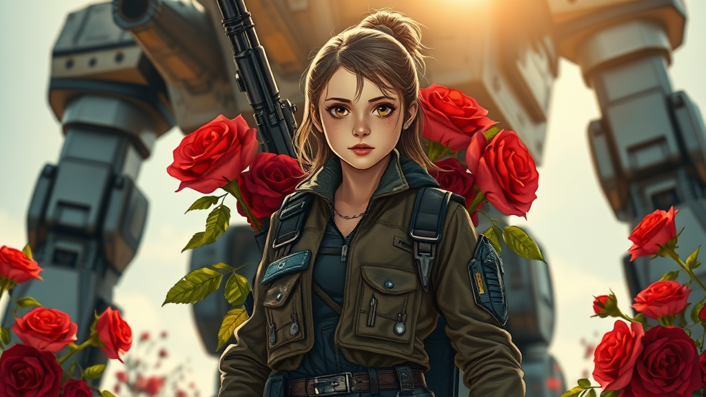 A young girl in a weathered futuristic suit stands confidently, embodying the essence of a Soviet-era poster. Behind her, vibrant red roses interlace with an imposing firearm, adding a touch of contrast to the background dominated by a towering Mech. The atmosphere is sunlit, casting warm hues across the scene, with the girl's expression radiating determination. The artwork is rendered in an anime and manga style, featuring dark, rich colors and a composition reminiscent of vintage offset printing. Every element is infused with intricate details and ornate patterns, drawing inspiration from Johanna Rupprecht and William Morris, showcasing a high level of detail. The poster exudes an 8k resolution quality, ideal for trending on art platforms like ArtStation.