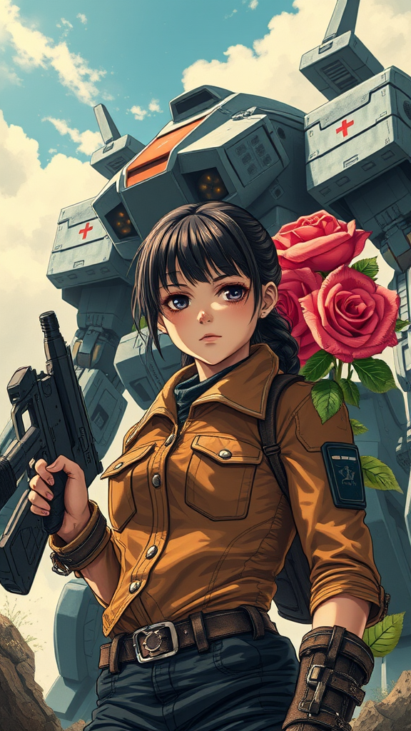 A young girl in a worn futuristic suit stands confidently, reminiscent of a classic Soviet poster style. Her determined gaze is set against a backdrop featuring both a sleek gun and vibrant roses intertwined, symbolizing strength and beauty. Behind her, a towering Mech looms, basking in the sunny weather. The scene is brought to life with anime and manga-inspired graphics, utilizing deep, dark colors and the meticulous detail of offset printing. The composition is a high-detail poster rendered in 8k resolution, showcasing intricate details and ornate illustration. Influences from the styles of Johanna Rupprecht and William Morris blend seamlessly, creating a piece that feels both modern and timeless, embodying an artwork that trends on Artstation.