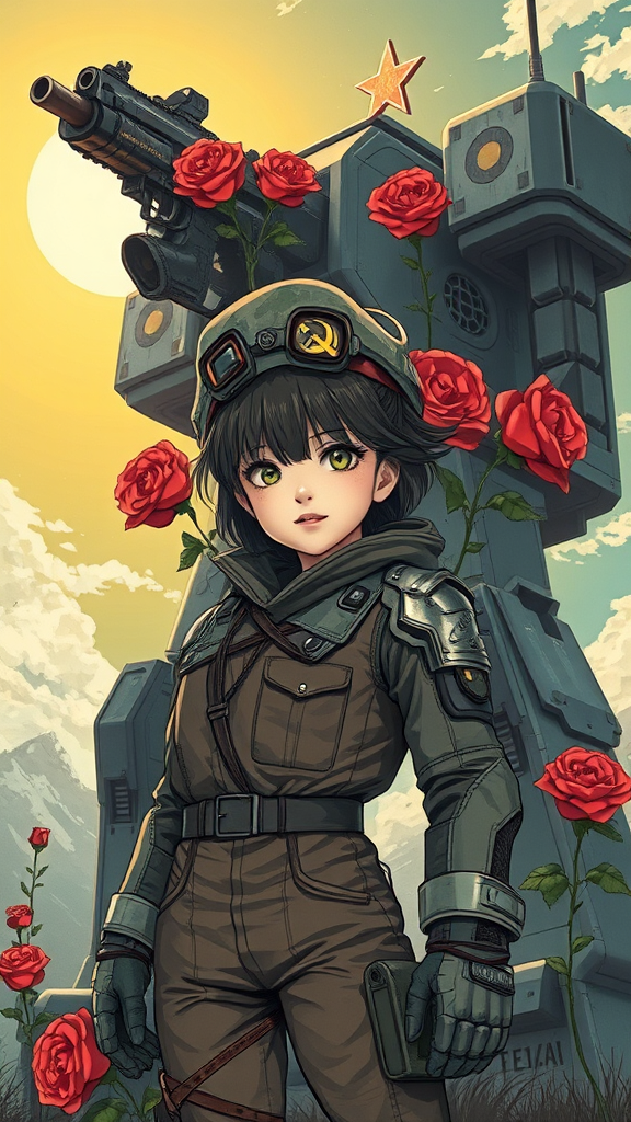 A young girl in a worn futuristic suit stands confidently, reminiscent of a Soviet poster style, with elements of both Soviet and USSR aesthetics. Behind her, a juxtaposition of a gun and roses sits against a backdrop of a massive mech under a bright, sunny sky. The scene is infused with anime and manga influences, utilizing dark tones to contrast the vibrant, intricate designs. The poster is rendered with high detail and ornate illustrations, demonstrating an offset printing style and an octane render approach. The image channels the artistic essence of Johanna Rupprecht and William Morris, capturing a modern yet vintage vibe. This artwork is at the cutting edge, trending on art platforms, showcasing detailed illustration and intricate ornamentation, all within a vertical format.