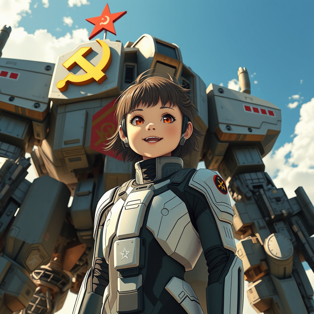 A young girl in an advanced sci-fi suit stands confidently, her expression determined and joyful. The design is influenced by Soviet-era posters, with bold, angular lines and a touch of vintage futurism. Behind her, a prominent hammer and sickle symbol is subtly integrated into the scene, blending seamlessly with the complex background of a towering mech, its metallic surface gleaming in the bright, sunny weather. The artwork is rendered in the vibrant style of anime and manga, with rich, dark colors and offset printing techniques enhancing the high level of detail. The poster feels alive with natural lighting, capturing a moment of optimism and strength in a sprawling, imaginative landscape. Offered in 8K HD quality, using the CMYK color model, the scene embodies a blend of nostalgia and futuristic vision, creating an immersive and captivating visual experience.