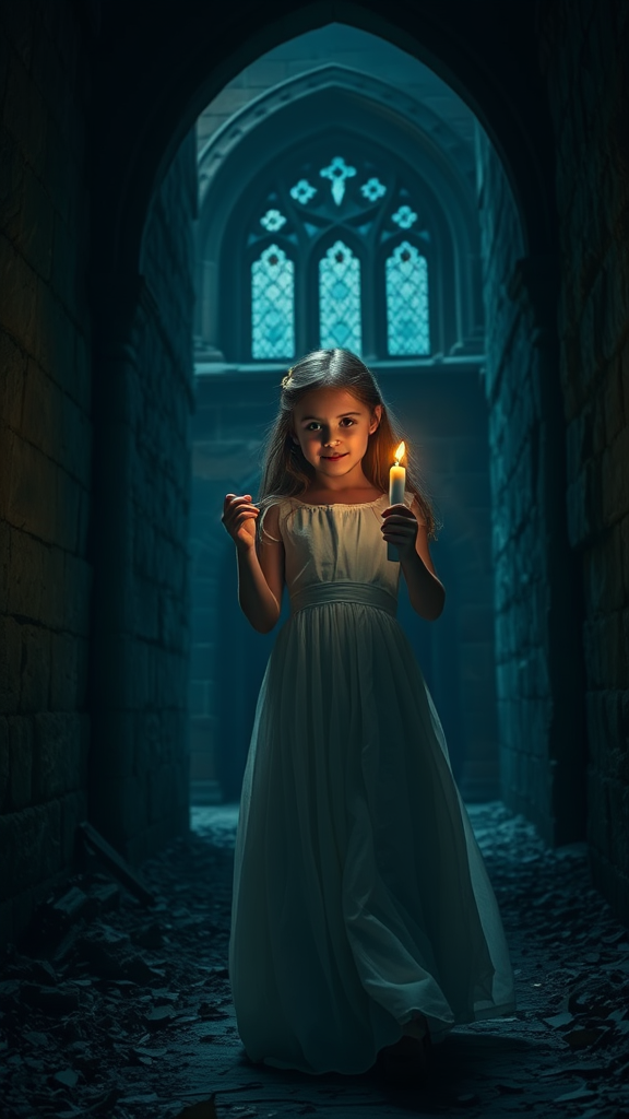 A young girl in an elegant long white dress, holding a flickering candle, navigates her way through the eerie shadows of a dark and foreboding castle. The atmosphere is chillingly silent, with the soft glow from the candle revealing glimpses of ancient stone walls and ornate, but decayed, archways. Her expression reveals a mix of curiosity and apprehension as she explores the unknown. The dim light also casts unsettling, elongated shadows, adding to the mystical aura of the scene. In the darkness, subtle hints of the castle's grand but haunting history linger, whispering secrets of its past.