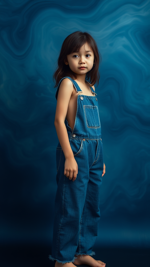A young girl in denim overalls stands posed for the camera, her form embracing Shige's wavy, dark azure aesthetic. Her stance is reminiscent of minimalist beauty, with a softly slumped, gently draped silhouette. The overall look carries a delicate, gongbi-inspired precision, with subtle frayed details that add a touch of texture to the scene. Her surroundings echo an air of serenity and quiet elegance, enhancing the artistic depth of her presence against a fluid azure backdrop.