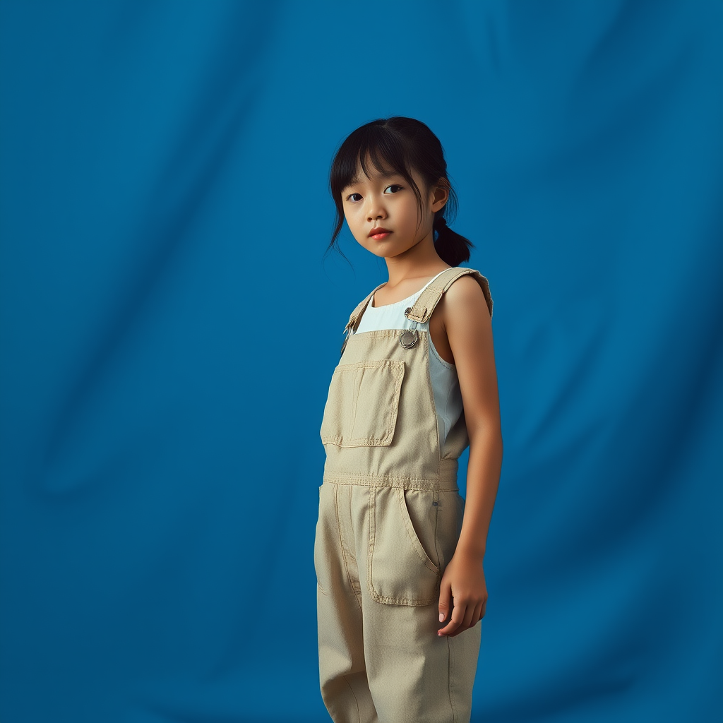 A young girl in overalls stands gracefully for the camera, embodying the signature style of Shige's aesthetic. Her surroundings manifest in wavy lines and deep azure tones, capturing a minimalist beauty. The fabric of her outfit appears slumped and delicately draped, with subtle hints of fraying edges that suggest a narrative of gentle wear. The overall composition is akin to the gongbi style, where each detail is meticulously rendered, blending a sense of elegance with understated sophistication.