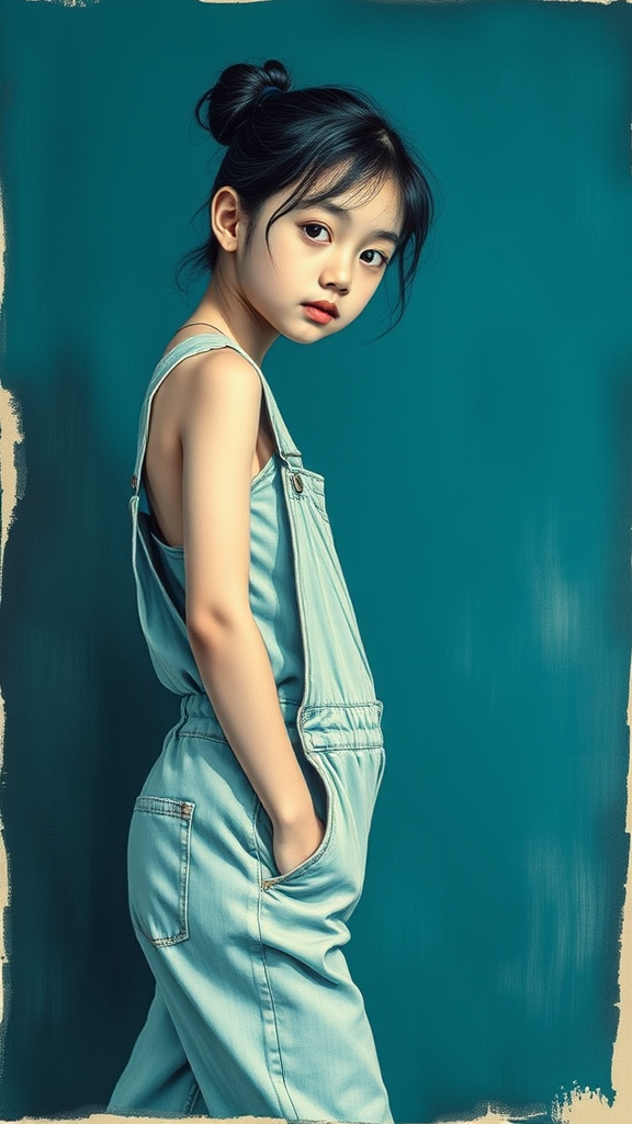 A young girl in overalls strikes a pose for the camera, embodying Shige's visual aesthetic with wavy lines and minimalist beauty. Her form is gracefully slumped and draped, evoking a sense of relaxed elegance. The scene is painted in deep azure tones, with a hint of gongbi's intricate detailing. The edges of the scene appear frayed, adding a touch of artistic imperfection.