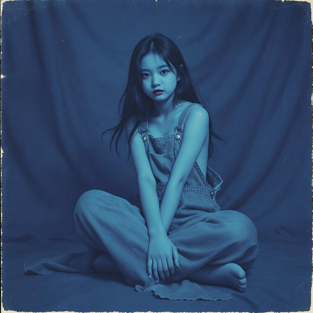 A young girl in overalls strikes a pose for the camera, embodying the essence of Shige's visual aesthetic. Her form is wavy and gracefully draped, with a minimalist beauty that captures attention. The scene is infused with deep azure tones, creating a sense of calm and mystery. Her posture, both slumped and elegantly relaxed, invokes the elegance of gongbi art. Subtle details like frayed edges add a touch of raw, artistic imperfection, enhancing the overall visual narrative.