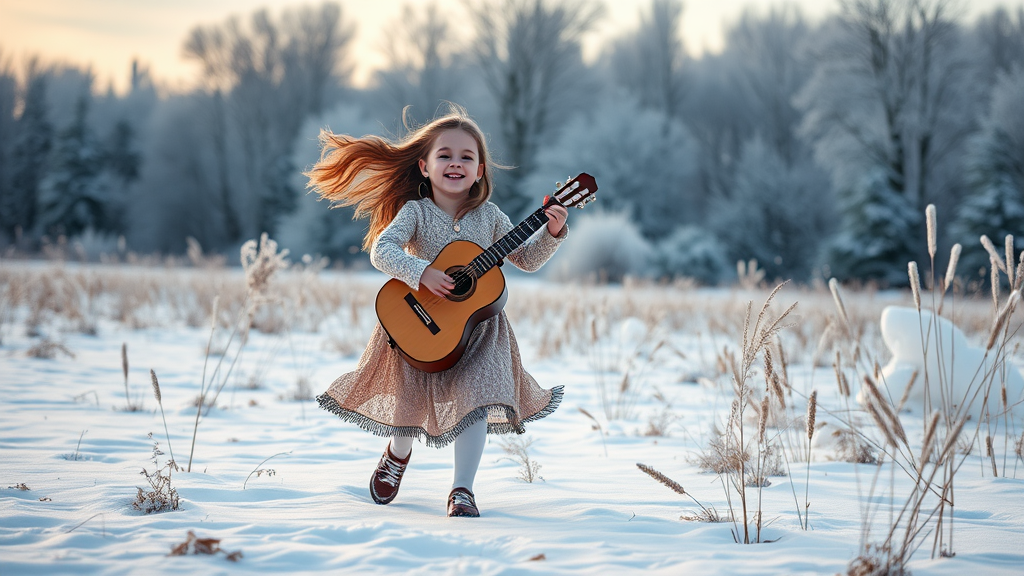 A young girl joyfully dances across the snowy meadow, her laughter mingling with the crisp winter air as she sings a cheerful tune, the notes of her bandura weaving a melodic tapestry that echoes through the frosted landscape.