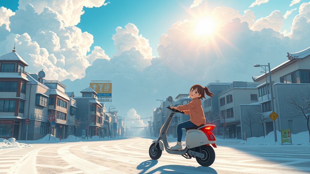 A young girl joyfully glides on an electric scooter through a mesmerizing anime scene inspired by Hayao Miyazaki, set in a serene, snow-dusted Tokyo cityscape. Towering, whimsical clouds drift lazily across the azure sky, casting playful shadows on the enchanting snowy streets below. Sunlight dances over the frosty landscape, illuminating the city in a warm, golden glow. The scene captures Miyazaki's signature blend of fantastical elements and breathtaking Japanese art, painting a picture of tranquility and wonder in a vibrant 16:9 panorama.