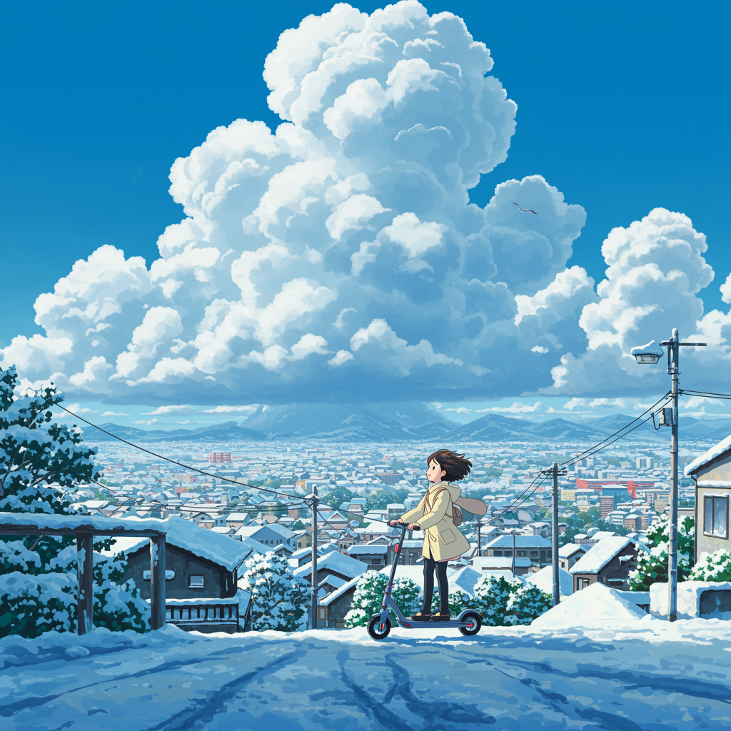 A young girl joyfully rides her electric scooter through an enchanting, Miyazaki-inspired anime scene of a snowy Tokyo. Massive, fantastical clouds drift through the azure sky, painted with the soft glow of the winter sun. Below, the city is transformed into a captivating snowscape, where the intricate textures of snow-laden rooftops and serene streets reflect the touches of Japanese artistic flair. The landscape unfolds with timeless beauty, blending Miyazaki's imagination and the gentle elegance of traditional Japanese art into a seamless, breathtaking journey.