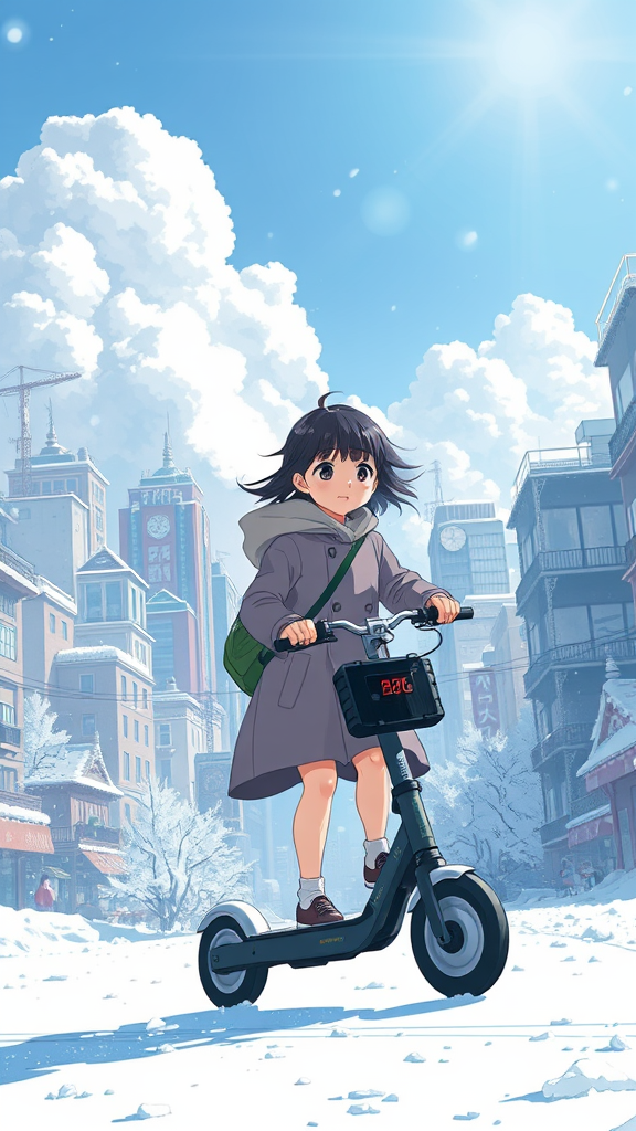 A young girl on an electric scooter glides through a magical anime-inspired Tokyo, crafted in the signature style of Hayao Miyazaki. The city is blanketed in snow, with enormous, fluffy clouds that hang like gentle giants in the clear blue sky. The sunlight dances upon the enchanting snowscapes of this bustling metropolis, revealing intricate details of Miyazaki’s dreamy landscapes. The scene is imbued with the elegance of traditional Japanese art, capturing the whimsy and wonder of a peaceful winter day.