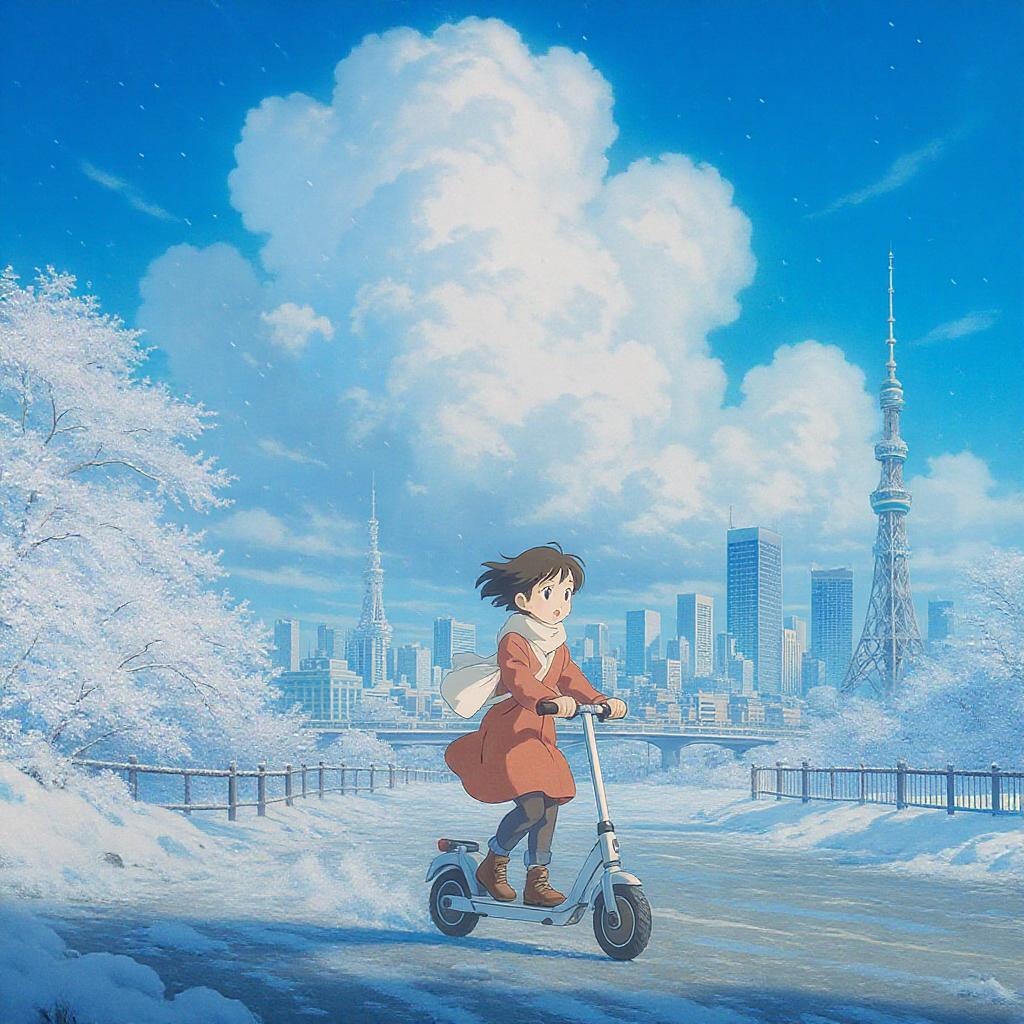 A young girl on an electric scooter glides through a wintry Tokyo, framed by majestic Miyazaki-esque clouds drifting across the azure sky. The cityscape, blanketed in snow, dazzles under radiant sunlight, capturing the essence of a whimsical anime world. The scene evokes Miyazaki's enchanting landscapes and ethereal charm, interwoven with the delicate artistry of traditional Japanese aesthetics.