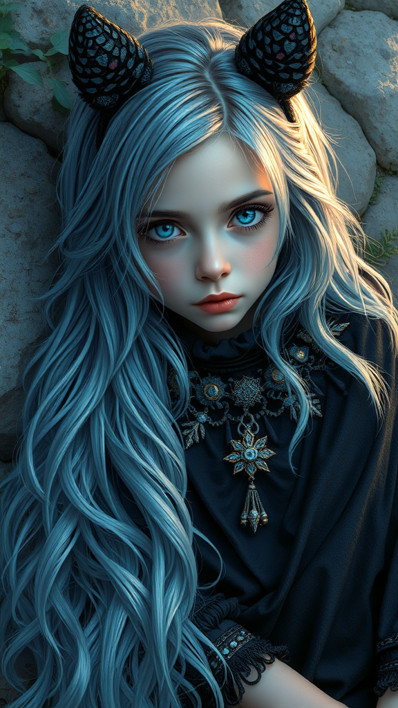 A young girl portrayed as a Greek priestess with streaked, two-tone hair resembling plant textures, capturing an essence of cold beauty. She resides at the Sites of Human Evolution near the Nahal Me’arot caves at Mount Carmel, embodying a Cyber Fairy Grunge vibe. Her striking ice-blue eyes and iridescent, intricate black-themed animal costume create a visual symphony, emphasizing an elaborate design reminiscent of a single character concept. The scene appears in highly detailed illustration with oil painting techniques seen on Artstation, exploring weird colors and gradient effects. Her position shifts between lying down and sitting on a lap, her ethereal presence emphasized by the play of cold and vibrant tones around her.