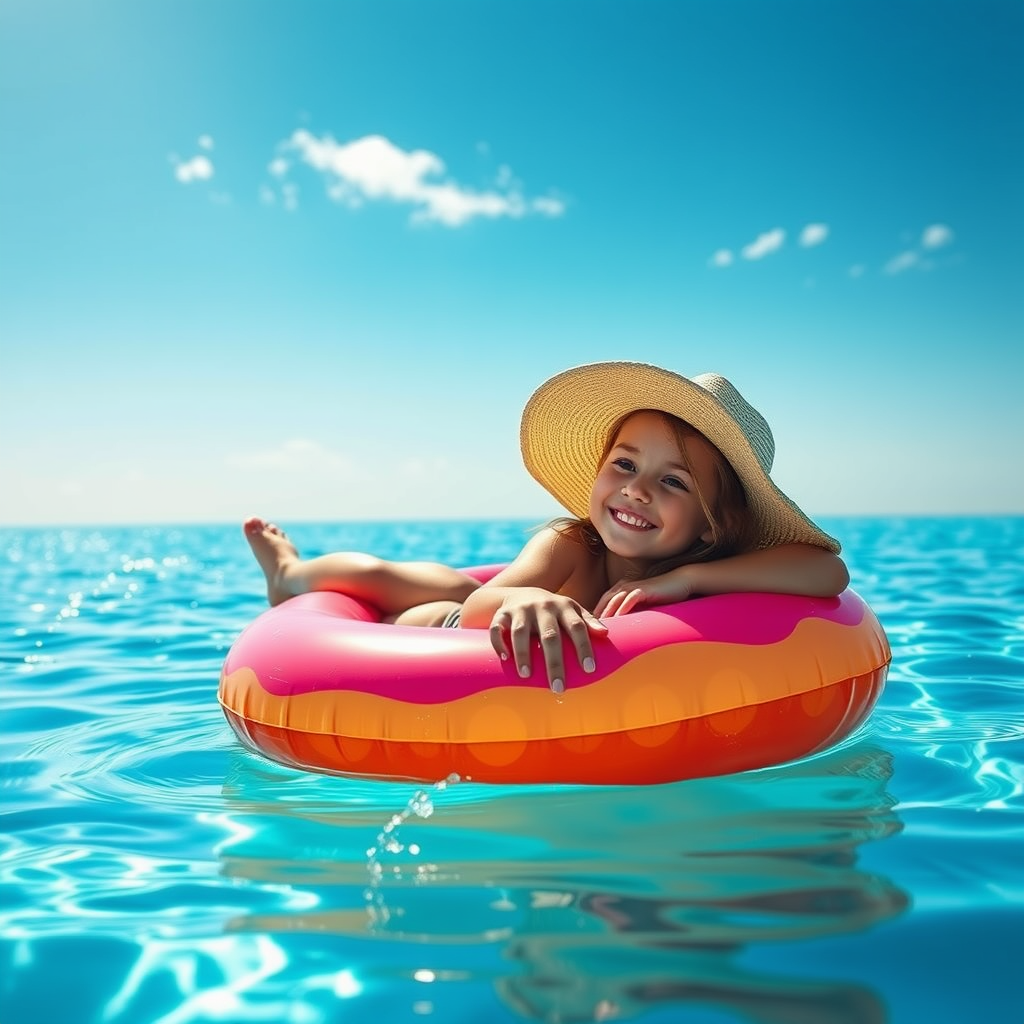 A young girl reclines on a vibrant pool float, gently bobbing on the shimmering water under the blazing summer sun. She wears a wide-brimmed hat, casting a playful shadow over her smiling face, while the distant hum of cicadas fills the air. Her fingers trail lazily through the cool water, creating ripples that dance across the surface. The fragrant scent of blooming jasmine lingers, adding to the sense of calm and relaxation. Above, a few wispy clouds accompany the bright blue sky, painting a picture of idyllic tranquility.