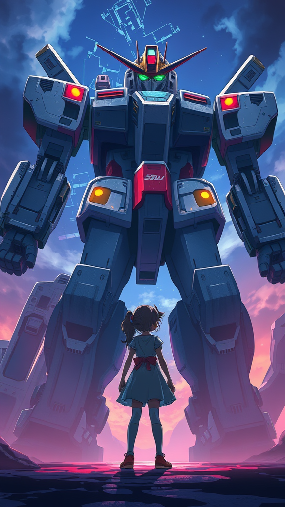 A young girl stands boldly before a towering mech robot, her silhouette stark against the machine's immense frame; the scene is infused with a sense of awe and determination; set in a dynamic anime-inspired style, capturing the essence of courage and wonder; the composition is a key visual masterpiece, with vibrant colors and intricate details that highlight the sheer scale of the mech contrasted with the girl's small yet fearless presence; the atmosphere is charged with a powerful energy, evoking an outstanding and unforgettable image.