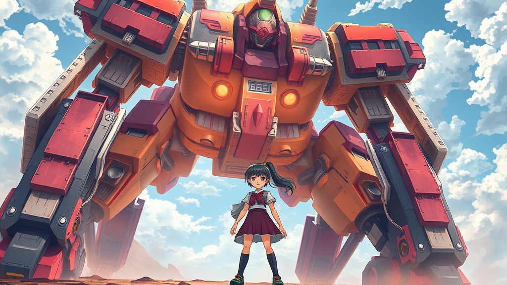 A young girl stands bravely in front of a colossal mech robot, the contrast highlighting her courage against the towering machine; concept art captures an intense and powerful scene reminiscent of epic anime visuals, with vibrant colors and dynamic composition illustrating a breathtaking key visual moment, showcasing an absolutely outstanding portrayal of determination and awe.