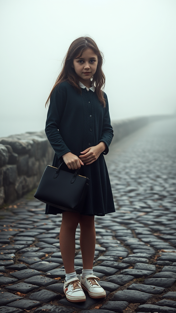 A young girl stands on a misty cobblestone path, clutching her handbag, reminiscent of Yigal Ozeri's style, capturing the essence of intimate beachside portraits. The scene is portrayed with a cinematic touch, echoing Kaethe Butcher's attention to detail, focusing on a close-up perspective. The overall composition channels Michael Malm's use of soft, muted hues, enhancing the serene atmosphere. The aspect ratio elongates the scene, emphasizing the ethereal blend of the girl's presence against the shadowy, fog-laden backdrop.