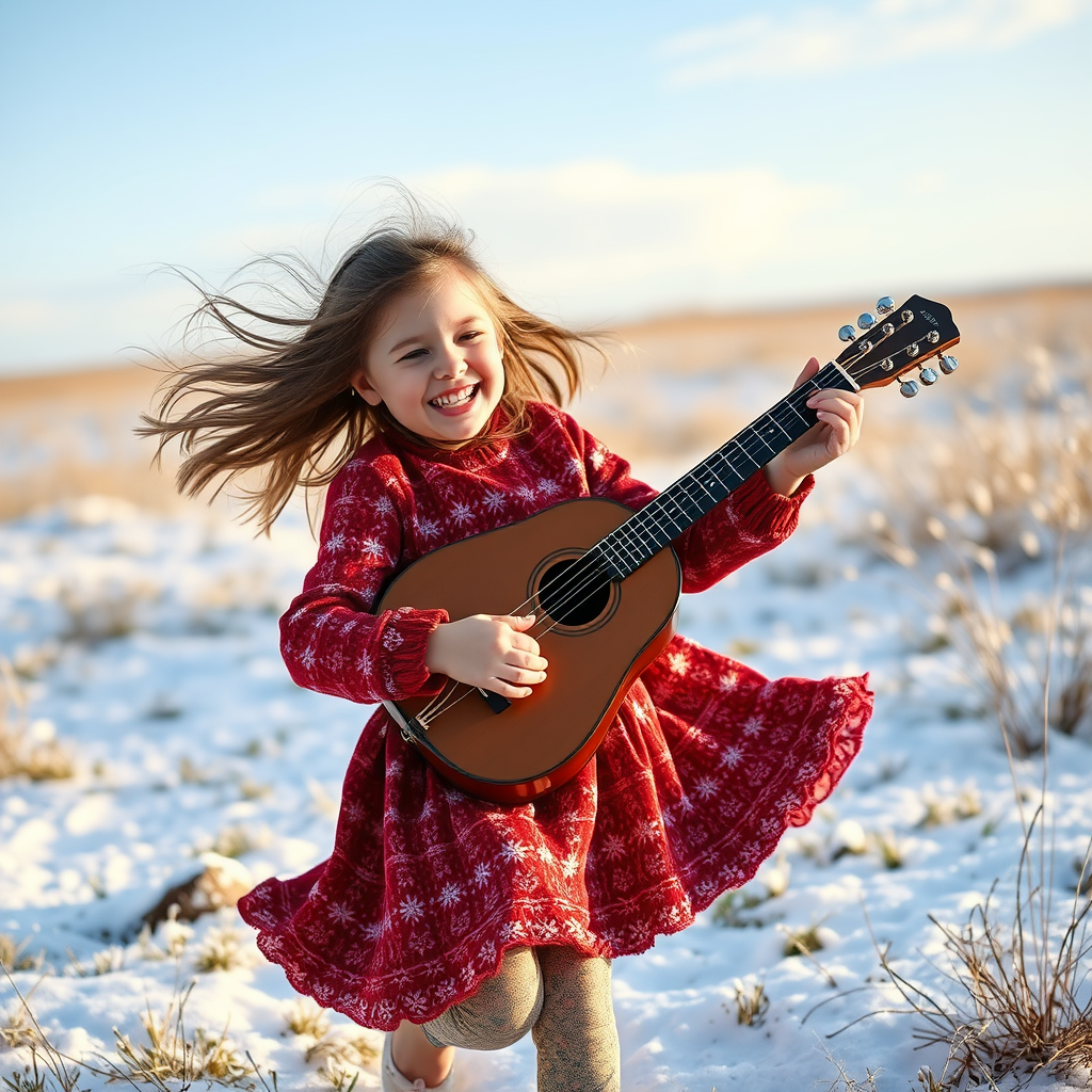 A young girl twirls joyfully through a snow-dusted meadow, her laughter mingling with the crisp winter air as she sings melodious tunes, her nimble fingers plucking the strings of a bandura, filling the landscape with enchanting harmonies.