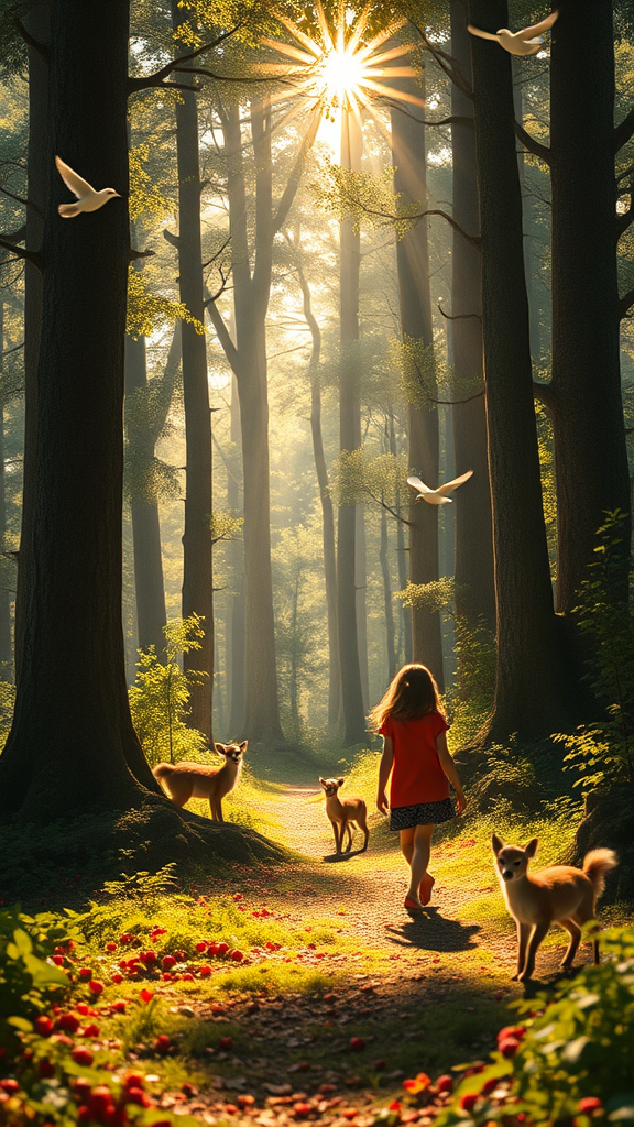 A young girl walks through an enchanting forest where the sun streams through the canopy, casting dappled patterns on the forest floor. Birds flit overhead, their silhouettes cutting through the golden light. She is surrounded by curious fawns, playful raccoons, and a sly fox that weaves through the undergrowth. Wild strawberries dot the path with their vibrant red, contrasting against the lush greens. The towering trees, reminiscent of a Hayao Miyazaki dreamscape, create a sense of gigantism, their bark rendered in ultra-realistic texture that you can almost touch. The scene is alive with contour light and high contrast, bringing every detail into sharp focus as if captured by a high-definition, 8k camera. There is an exquisite depth of field, with a bokeh effect that blurs the background into a soft tapestry of nature's colors. The air is filled with a magical, slightly dark tone, making the experience feel like an epic frame from a cinematic masterpiece, where each element is captured with super realistic texture and photorealism, inviting you to step deeper into this captivating world.