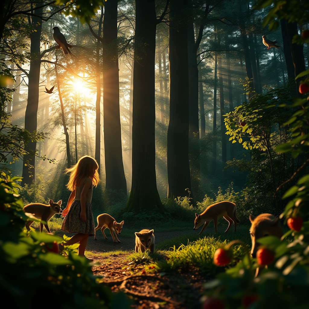 A young girl wanders through a magical forest as the sun filters through the towering trees, casting a warm glow on the vibrant scene. Birds flutter gracefully overhead, while curious fawns peer from behind lush foliage. Mischievous raccoons scuttle playfully across the forest floor, and a sleek fox darts by, its fur shimmering in the dappled light. The scent of ripe strawberries fills the air, adding a sweet note to the earthy atmosphere. Captured in the enchanting style of Hayao Miyazaki in 8k HD, the scene is bathed in contour light, creating high contrast and a deep depth of field that highlights ultra-detailed, photorealistic textures. The cinematography captures a sense of gigantism from a first-person perspective, immersing the viewer in the rich tapestry of the environment. Subtle dark tones and bokeh effects add a layer of mystery to this epic frame, making it feel both intimate and expansive, with super realistic textures that almost make the forest palpable.