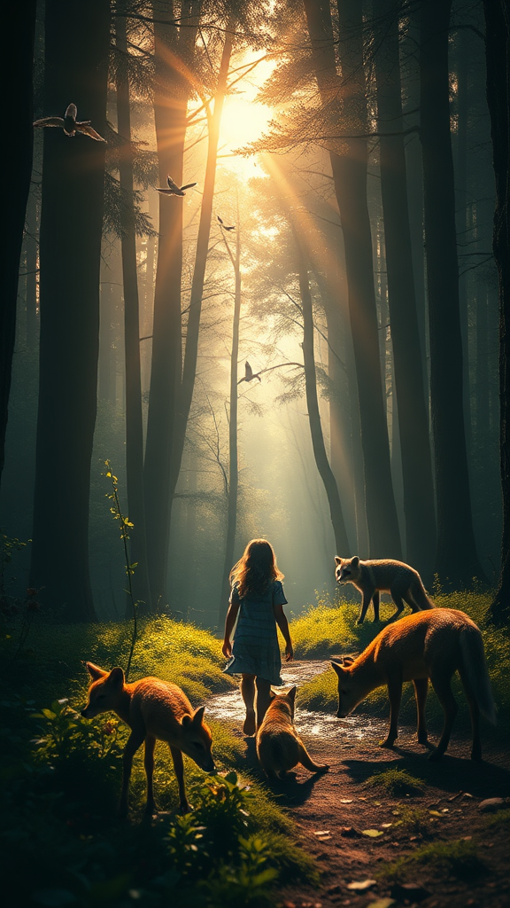 A young girl wanders through an enchanted forest where the sun filters softly through the towering trees, casting a warm glow. In the distance, birds weave through the sky, their silhouettes against the light. Gentle fawns graze near a bubbling brook, watched over by curious raccoons and a sly, red-coated fox. The air is sweet with the scent of wild strawberries nestled among the underbrush. This scene is reminiscent of Hayao Miyazaki's dreamy, lush landscapes, captured in ultra-high definition with 8K clarity. The play of contour light creates striking contrasts, each element rendered with astounding detail and photorealistic texture. The cinematography reveals a sense of gigantism, as though viewing this magical world from the perspective of a tiny wanderer. The depth of field with selective focus adds dramatic bokeh to the forest's edges, enriching the dark, yet vibrant tones, and encapsulating the scene in an epic frame filled with super realistic texture, pulling you into its majestic splendor.