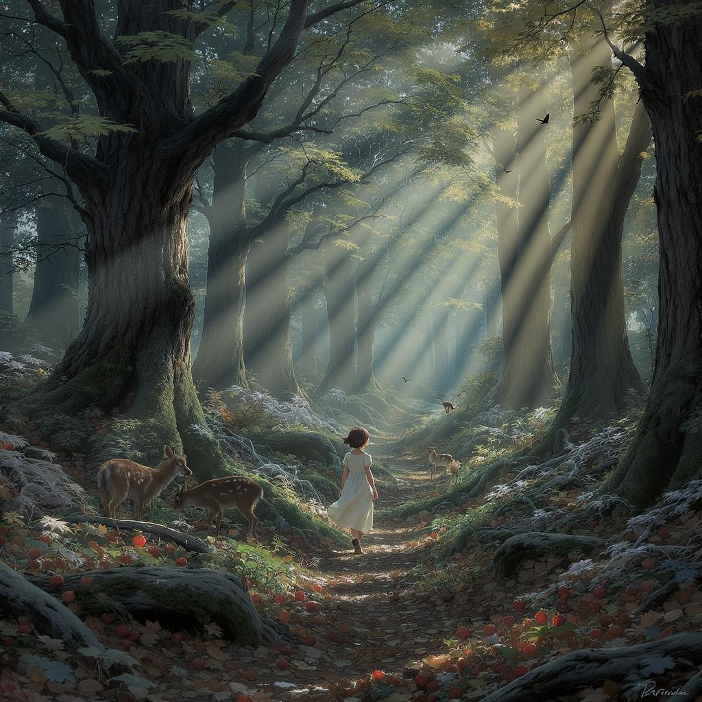 A young girl wanders through an enchanting forest where sunlight filters through the tall trees, casting intricate lace patterns on the ground. Birds flit between branches, their songs mingling with the rustle of leaves. Nearby, fawns nibble on lush grass, and raccoons playfully peek from behind tree trunks, while a curious fox watches from a distance. Wild strawberries peek from beneath the foliage, their red hue vibrant against the greenery. The scene captures the essence of nature's beauty in a Hayao Miyazaki-inspired style, rendered in ultra-high-definition 8k resolution with stunning contour lighting and high contrast. The depth of field creates a cinematic quality, with every leaf and texture meticulously detailed, giving the entire setting a sense of gigantism as seen from a first-person perspective. The atmosphere balances between a dark, moody tone and the warmth of sunlit spaces, enriched by the bokeh effect that adds layers of mystery and wonder. This epic scene is a super-realistic tableau where every detail contributes to the breathtaking tapestry of the natural world.