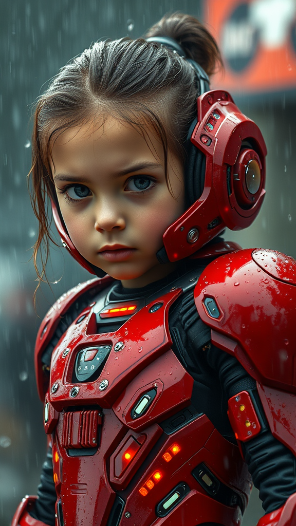 A young girl wearing a crimson robotic exosuit stands determinedly in the pouring rain, her expression both fierce and curious. The hyperrealistic details of her suit glisten with raindrops, capturing the intricate blend of mechanical and organic design. A close-up reveals the glint of LEDs embedded within the suit's panels, contrasting with her resolute eyes. The scene embodies the whimsical yet intricate style reminiscent of Skottie Young, while evoking a surreal, ethereal atmosphere akin to Daria Endresen's work. The entire composition combines elements of webcore aesthetics and Eve Ventrue's vivid artistry, creating an immersive, lifelike portrait in stunning high-definition.