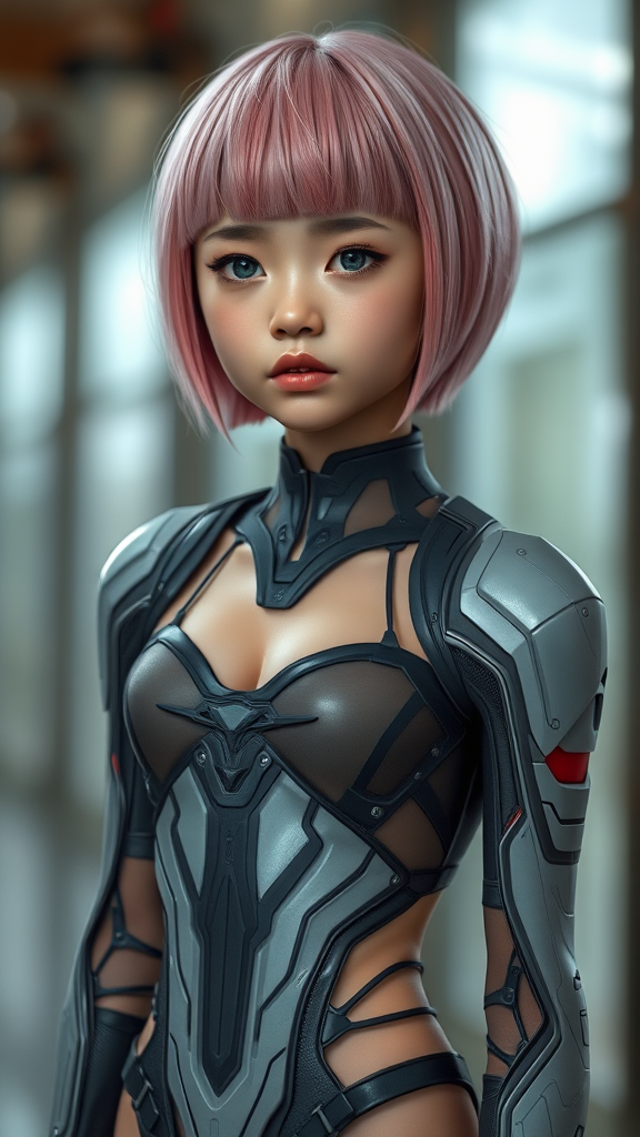 A young girl with a beautiful face, featuring short pink hair with blunt bangs. She wears a futuristic outfit, inspired by Evangelion and cyberpunk styles, with an intricate, sleek, and partially transparent design. The figure is characterized by a narrow waist and thin thighs. Cinematic lighting highlights her, with extreme detail in the textures and remarkable focus on the intricacies of her skin and features. The portrait captures the essence of high-definition photography with sharp focus and depth of field, producing a bokeh effect. The overall aesthetic is one of realism and sophistication, shot with a cinematic camera setup. The artwork eliminates any disfigurement or anatomical errors, maintaining realistic proportions and an accurate depiction of human anatomy. The scene is void of any additional limbs or deformations, ensuring that the focus remains on the detailed and expressive portrait of the girl in her strikingly designed attire.