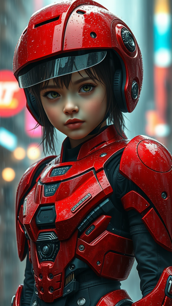 A young girl with a crimson mech suit stands amidst the pouring rain, her expression serene and defiant, captured in hyperrealistic detail. Her suit, a blend of futuristic designs with intricate gears and circuits, gleams wetly, reflecting the city lights. The rain cascades off her helmet, her eyes bright and focused beneath. The style echoes the whimsical yet edgy flair of Skottie Young, with hints of Daria Endresen's moody elegance. The scene is beautifully rendered in ultra-high definition, capturing every raindrop and metallic sheen, reminiscent of the vivid, modernity-infused aesthetics of webcore, with a touch of Eve Ventrue's atmospheric intensity. The composition is tall and narrow, emphasizing her solitary figure against the urban backdrop.