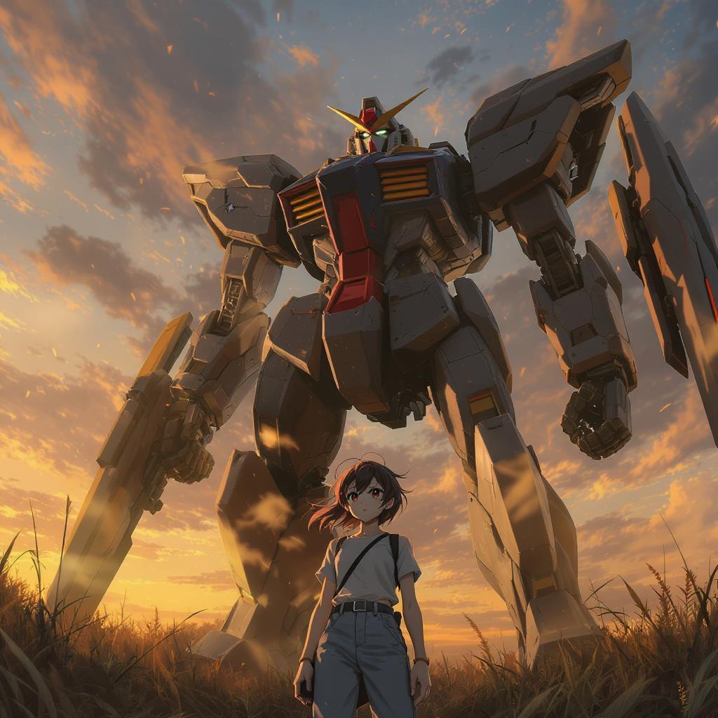 A young girl with a determined expression stands confidently in front of an enormous mech robot, bathed in the golden hue of twilight, its intricate and awe-inspiring design looming majestically against the horizon, evoking a sense of power and mystery; an anime-inspired scene capturing the climactic moment, an iconic key visual showcasing the striking contrast between her small but unyielding presence and the towering metallic sentinel, an absolutely mesmerizing depiction blending hope and grandeur.