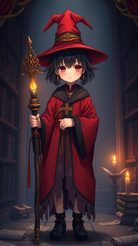 A young girl with a fantasy theme, she has very short black twintails and is dressed in a striking red and black robe, blending Arabic style with magical elements. She holds a magic staff and is surrounded by enchanted scrolls and has a witch hat adorned on her head. She stands in a dimly lit library, illuminated by the gentle glow of a single candle. The image is rendered in 8k resolution with UHD and HDR quality, capturing every detail with stunning clarity. The scene is free from any distractions like watermarks, logos, or text, maintaining a focus on the character and her surroundings.