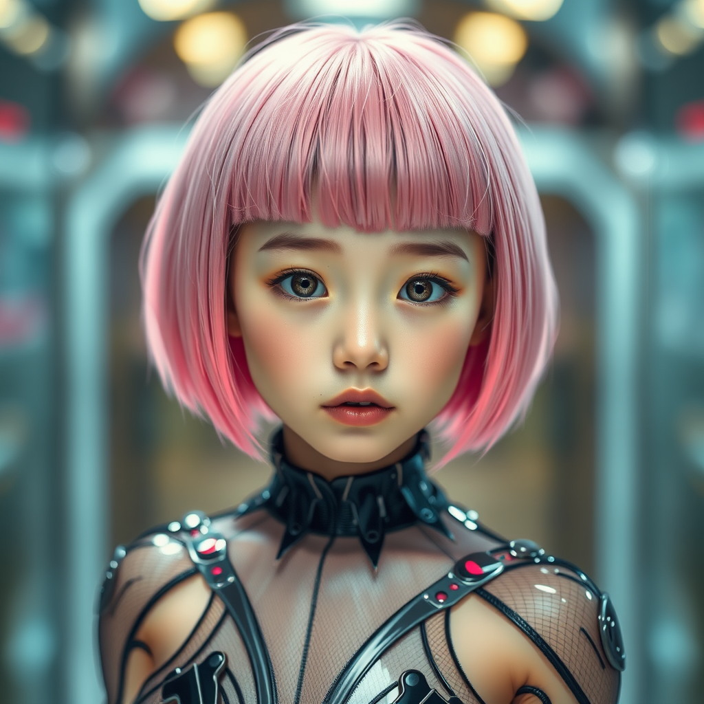 A young girl with a stunningly beautiful face, sporting pink short hair with blunt bangs. She wears a futuristic outfit in an intricate, sleek, and transparent style, reminiscent of Evangelion and cyberpunk aesthetics. Her appearance is marked by a narrow waist and slender thighs. The portrait captures extreme detail with cinematic lighting, sharp focus, and depth of field effects, creating a bokeh effect. The shot is incredibly high-definition with an emphasis on a realistic texture to her skin and detailed pupils. The scene is captured using a cinematic camera, resulting in a candid, studio-like quality. The character’s futuristic allure is enhanced by her unique style and captivating presence, combining the essence of intricate art with an ultra-realistic touch.