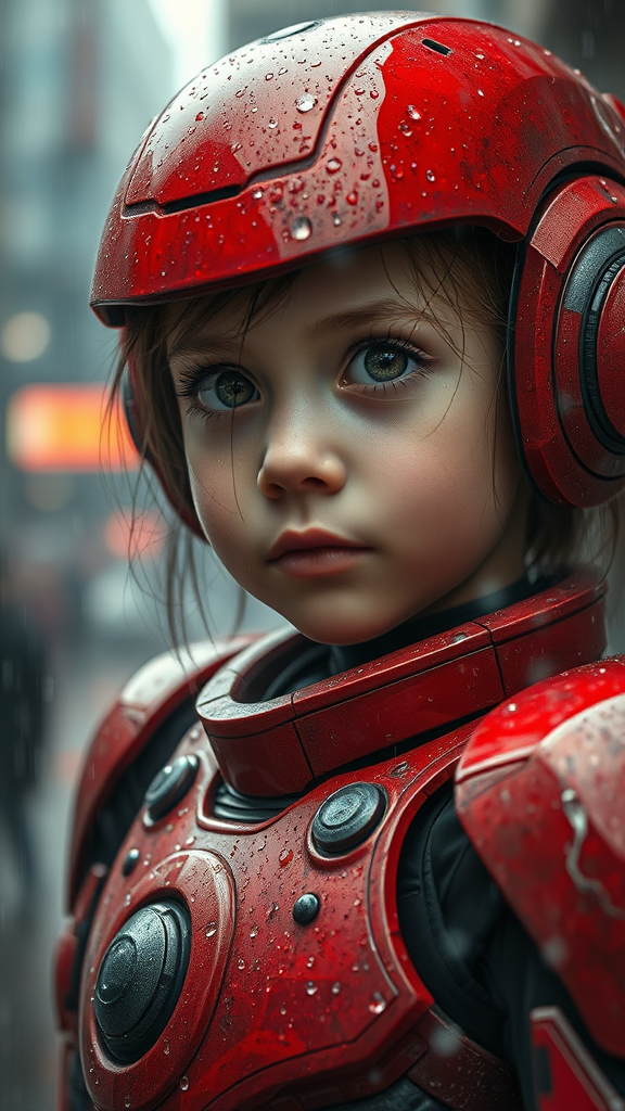 A young girl with a weathered crimson robot suit, droplets glistening as the rain cascades down, her eyes reflecting a mix of determination and wonder. Her suit is intricately detailed, merging futurism with a touch of whimsy, as if crafted by Skottie Young. The hyperrealism captures every nuance of the scene in striking 32k UHD clarity, reminiscent of Daria Endresen’s ethereal style. The perspective is a close-up, drawing you into the world of webcore aesthetics, with a hint of dreamlike fantasy akin to Eve Ventrue. The scene conveys a vivid narrative, set against a moody urban backdrop with an elongated aspect ratio of 9:16, adding a dramatic flair to the moment.