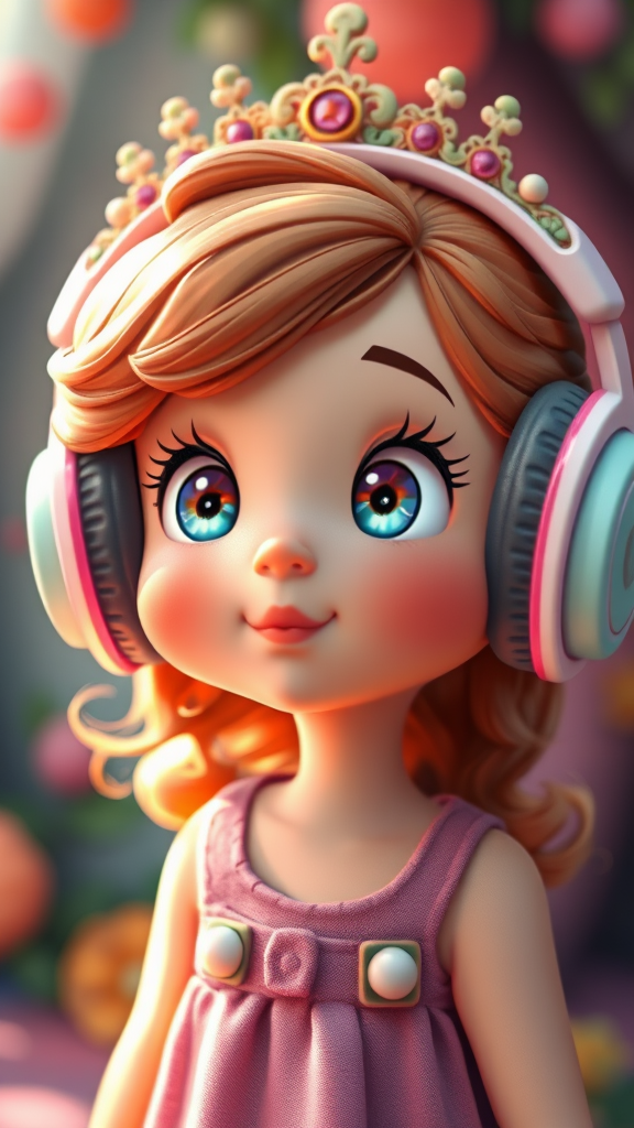 A young girl with bright, curious eyes wearing oversized headphones, in a whimsical Disney-inspired style with a soft clay-like texture. Her expression is one of awe and wonder as she listens to a magical, unseen world. Delicate curls frame her face, and she stands in a vibrant, fairytale-like setting, with colors that pop and exude warmth and charm. The headphones, adorned with tiny, intricate details, seem almost like a crown fit for a princess of sound.