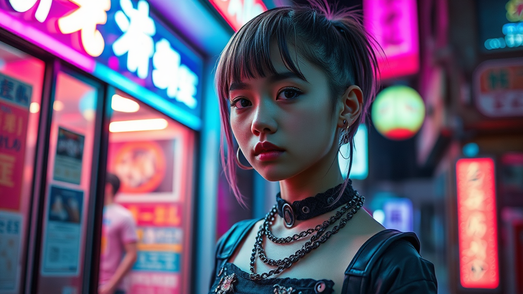 A young girl with cropped hair stands in an urban setting, bathed in the vibrant glow of a neon-lit storefront. Her attire reflects an eclectic mix of cult party kei fashion, adorned with intricate details reminiscent of alienpunk aesthetics. The scene is captured in the style of hyper-realistic genre paintings, with an interplay of light and color that brings out the textures and subtlety. The rich, detailed composition evokes the artistry of Ivan Marchuk, capturing every nuance with a Fujifilm X-T4 and a Sony FE 85mm f/1.4 GM lens. The portrait resonates with raw, unfiltered style, presenting an immersive tableau that melds traditional techniques with futuristic themes.