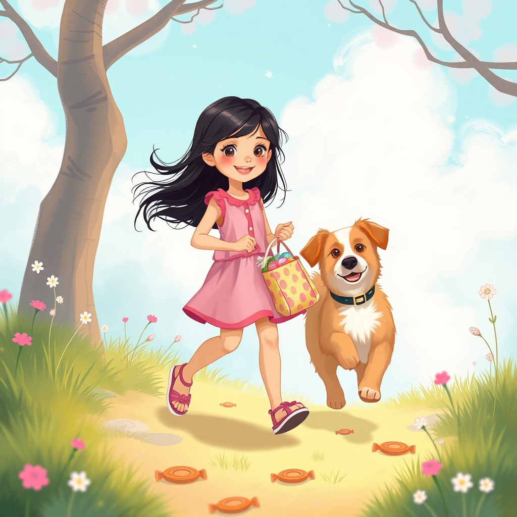 A young girl with flowing black hair, dressed in a playful pink outfit and charming sandals, strolls joyfully alongside her furry companion, a dog with soft, tawny fur, as they explore a whimsical world of pastel hues. The girl clutches a colorful bag filled with assorted candies, her eyes gleaming with excitement and curiosity. The scene captures a magical and adventurous spirit, with the duo basking in the gentle light of a dreamy, illustrated landscape.