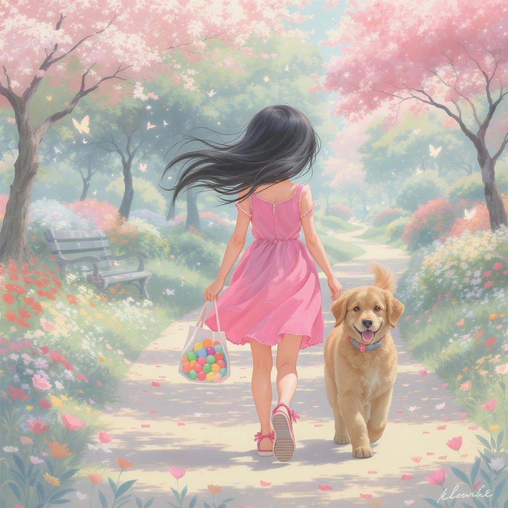 A young girl with flowing black hair dressed in a pink sundress and matching sandals strolls through a whimsical park. Her loyal pet dog, with soft, velvety brown fur, playfully walks beside her. The girl clutches a small tote brimming with colorful candies that catch the soft sunlight. The scenery around them is painted in gentle pastel colors, casting a dreamy aura. Scattered wildflowers dot the path, and butterflies flutter gracefully, adding a touch of magic to their joyful adventure.
