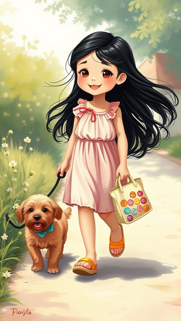 A young girl with flowing black hair wearing a light pink sundress and sunny yellow sandals, strolls cheerfully alongside her friendly brown-furred dog. She clutches a small, colorful tote bag filled with assorted candies. The scene is painted in soft, pastel hues, evoking a warm, whimsical atmosphere. Delicate flowers bloom along their path as the sun casts gentle shadows, capturing the essence of a carefree childhood adventure.