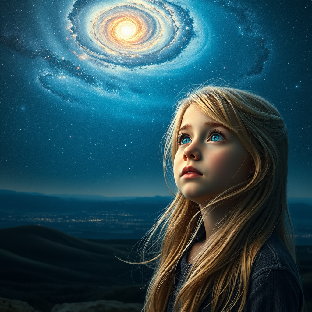 A young girl with flowing blonde hair and piercing blue eyes gazes into the vast expanse of space, her expression reflecting a sense of wonder and curiosity. The backdrop is a breathtakingly detailed and photo-realistic landscape, depicting a serene scene where the infinite cosmos meets the horizon. Stars twinkle in the distance, while swirling galaxies and distant nebulae paint a mesmerizing tapestry in the night sky. The girl's realistic features are softly illuminated by the celestial glow, capturing the essence of tranquility and exploration.