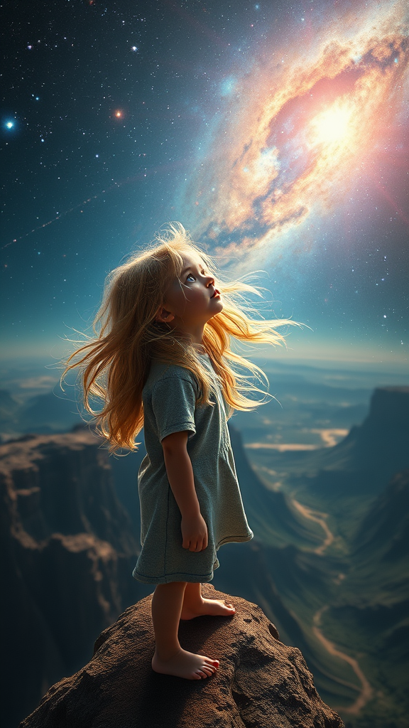 A young girl with flowing blonde hair and piercing blue eyes gazes intently into the vast expanse of space. The scene is set amidst a backdrop of photo-realistic cosmic landscapes, where the vibrant hues of distant galaxies and stars create a breathtaking tapestry of color and light. The girl's figure is depicted with realistic human details, capturing her awe and wonder as she stands on the edge of an alien cliff, overlooking the celestial beauty of the universe. Subtle wisps of cosmic dust float around her, adding an ethereal quality to the scene.