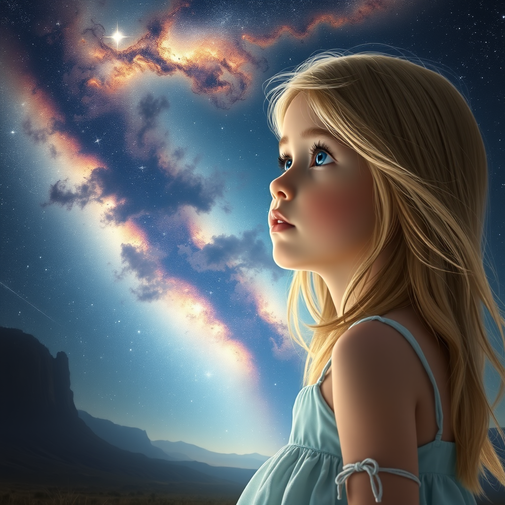 A young girl with flowing blonde hair and piercing blue eyes gazes towards the vast expanse of space, her expression one of awe and wonderment. She stands amidst a photo-realistic landscape, her delicate features illuminated by the soft, ethereal glow of distant stars. The realistic depiction of her human figure harmonizes with the intricate details of the cosmic vista before her, where swirling galaxies and shimmering nebulae paint a breathtaking, celestial tapestry. The tranquil scene seems to capture a moment suspended in time, where the boundaries between earthly beauty and the mysteries of the universe blur seamlessly into one.