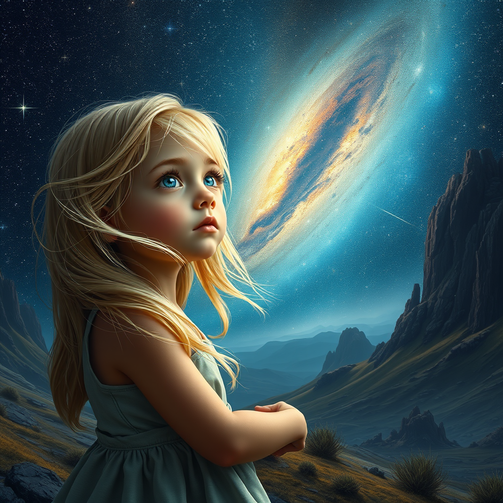 A young girl with flowing blonde hair and striking blue eyes gazes intently into the vast expanse of space, surrounded by a breathtaking photo-realistic landscape that captures the beauty of the cosmos. Her expression is one of awe and wonder, as the infinite stars and distant galaxies reflect softly in her eyes. The landscape is richly detailed with a blend of natural elements, creating a harmonious contrast between the earth beneath her feet and the endless universe above. Her pose is graceful yet grounded, adding to the realism of the human figure amidst this celestial setting.