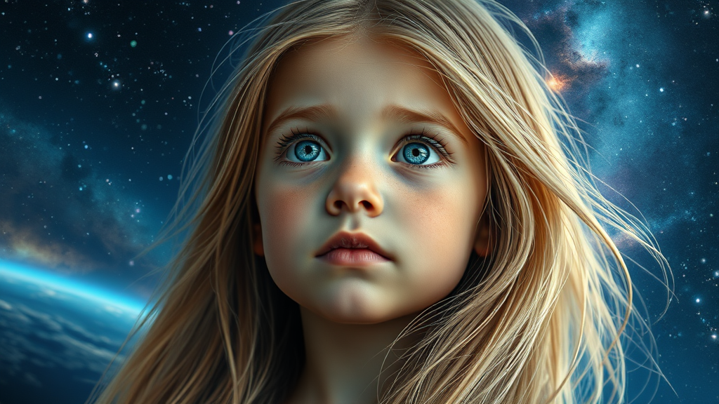 A young girl with flowing blonde hair and striking blue eyes gazes into the vastness of space, set against a backdrop of stunning, photo-realistic cosmic landscapes. Her features are rendered with lifelike precision, capturing the wonder and curiosity in her expression as the universe unfolds before her. The ethereal glow of distant galaxies and stars reflects subtly in her eyes, enhancing the mesmerizing scene.