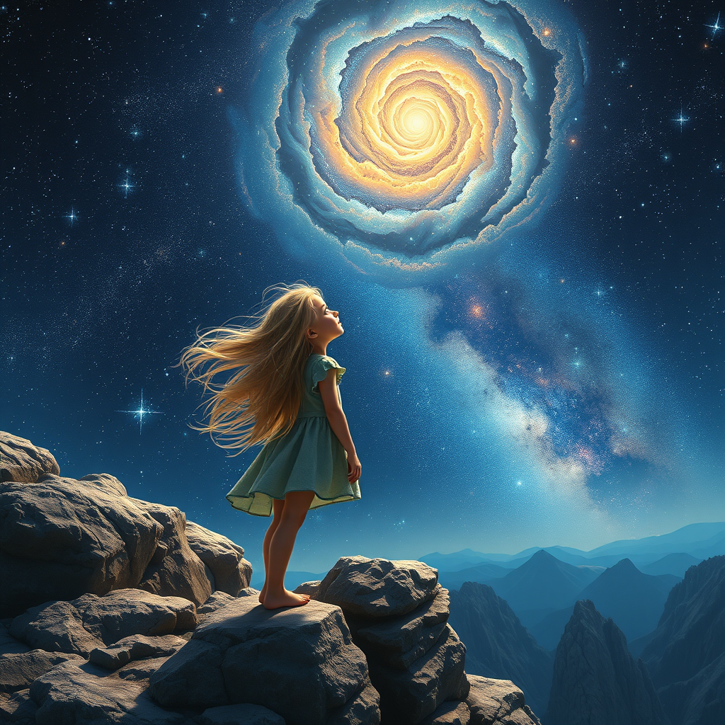 A young girl with flowing blonde hair and striking blue eyes stands on a rocky precipice, gazing into the vast expanse of space. Around her, the landscape blends photorealistic natural beauty with intricate celestial elements, where the night sky is filled with luminous stars and swirling galaxies. Her expression is one of wonder and curiosity, reflecting a serene connection between humanity and the universe. Her figure is depicted with delicate realism, her presence harmonizing with the ethereal glow of the cosmos above.