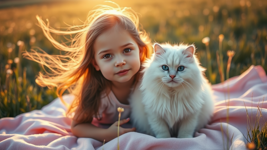 A young girl with flowing hair sits on a pastel pink blanket in a sun-drenched meadow, with a fluffy white cat perched beside her, its eyes a striking blue, capturing an intimate moment. The scene is captured in breathtaking 4k resolution, showcasing cinematic details—the girl's soft expression, the delicate texture of the fur, and the warm glow of the setting sun casting gentle shadows.