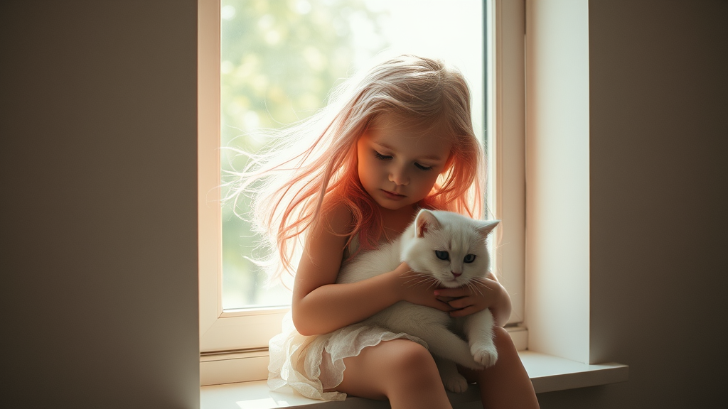 A young girl with flowing pink hair sits on a sunlit windowsill, cuddling with a fluffy white cat. The room is bathed in a soft, warm glow, with rays of sunlight casting delicate patterns on the walls. The scene is captured in stunning 4K quality, with intricate details evident in the girl's serene expression and the cat's shimmering fur. This cinematic moment feels like a frame from a beautiful, timeless film.