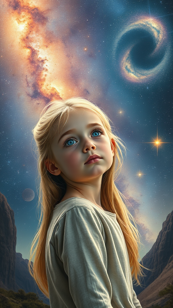 A young girl with golden blonde hair and striking blue eyes gazes intently into the vast expanses of space, standing amidst a breathtakingly realistic landscape where star-speckled skies and twisting galaxies illuminate her serene expression. The scene captures the intricate details of her human figure, blending seamlessly with the ethereal beauty of the cosmos, as if she is part of a dreamlike painting that touches the edge of reality.