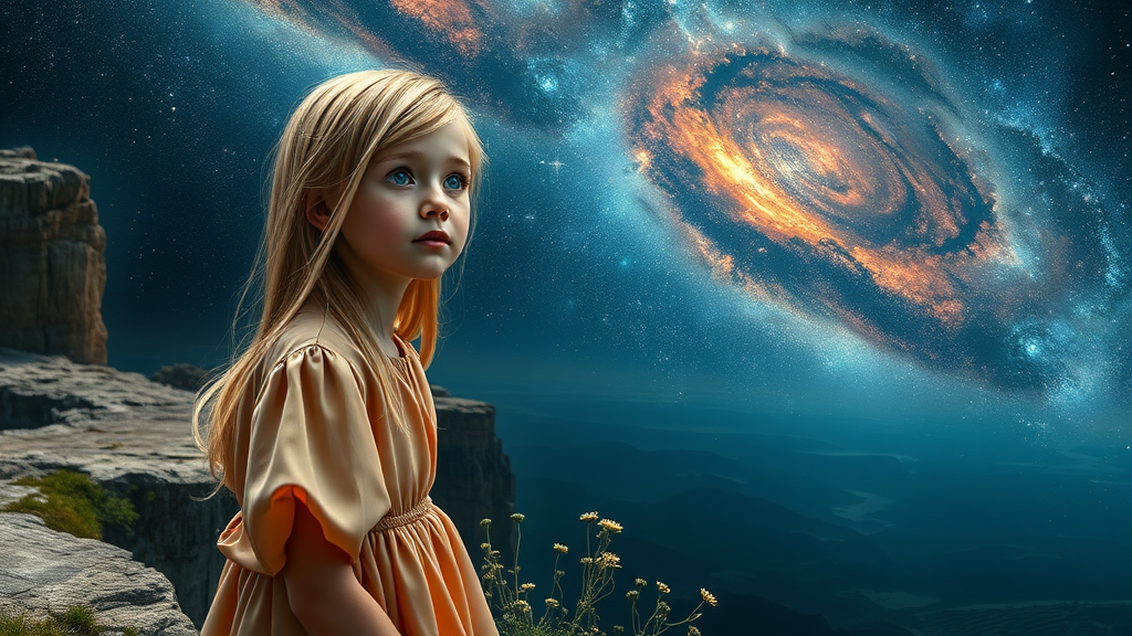 A young girl with golden blonde hair softly flowing around her shoulders stands at the edge of an expansive cliff, her striking blue eyes gazing intently into the infinite cosmos above. The scene is rendered in breathtaking photorealism, capturing the delicate details of her features as starlight casts a gentle glow on her skin. The majesty of the galaxy stretches beyond, a swirling tapestry of vivid colors filled with distant stars and nebulae, juxtaposed against the vast, velvety blackness of space. She is dressed in a simple, elegant gown that mirrors the hues of the night sky, subtly blending her presence with the universe's grandeur. The awe-inspiring landscape around her is lush and serene, with delicate wildflowers gently swaying in the whispering celestial breeze, making the moment feel like a bridge between the earth and the heavens.