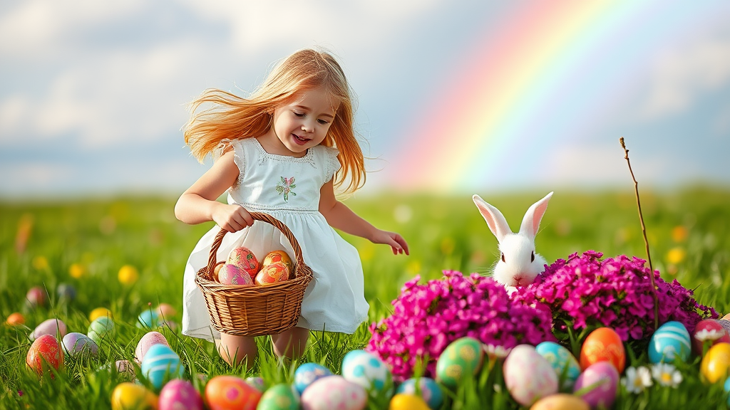 A young girl with golden hair frolics in a sunlit meadow, surrounded by an array of colorful Easter eggs of varying sizes and intricate designs. She dons a white dress adorned with a subtle floral motif and holds a woven basket brimming with vividly painted eggs. Nearby, a fluffy white bunny playfully peeks out from behind a vibrant bush, its nose twitching in delight. In the background, a brilliant rainbow gracefully arches across the sky, infusing the enchanting scene with a sense of wonder and magic.