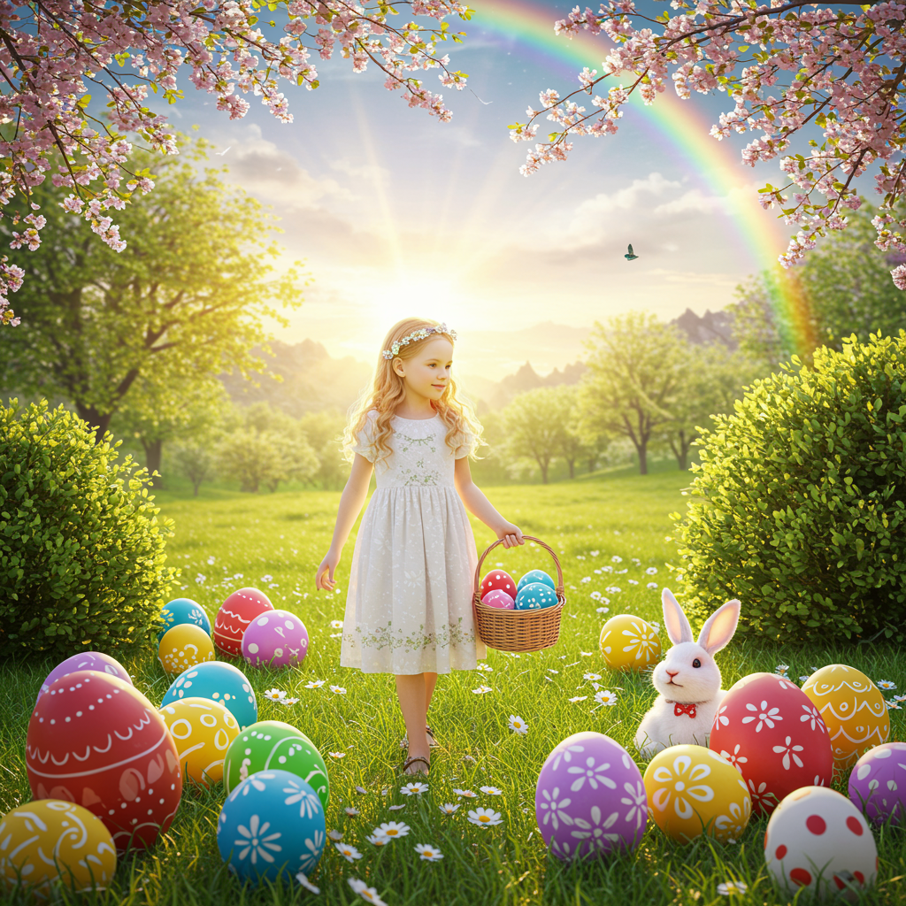 A young girl with golden hair stands gracefully in a sunlit meadow, surrounded by a vibrant array of Easter eggs in various sizes and intricate designs. The warm rays of the sun illuminate the scene, casting a gentle glow. She is dressed in a white gown adorned with a delicate floral pattern, and she carries a woven basket overflowing with vividly colored eggs. Nearby, a fluffy white bunny peeks charmingly from behind a bush, its nose twitching with delight. In the background, a magnificent rainbow arcs across the sky, adding a touch of whimsy to the magical setting.